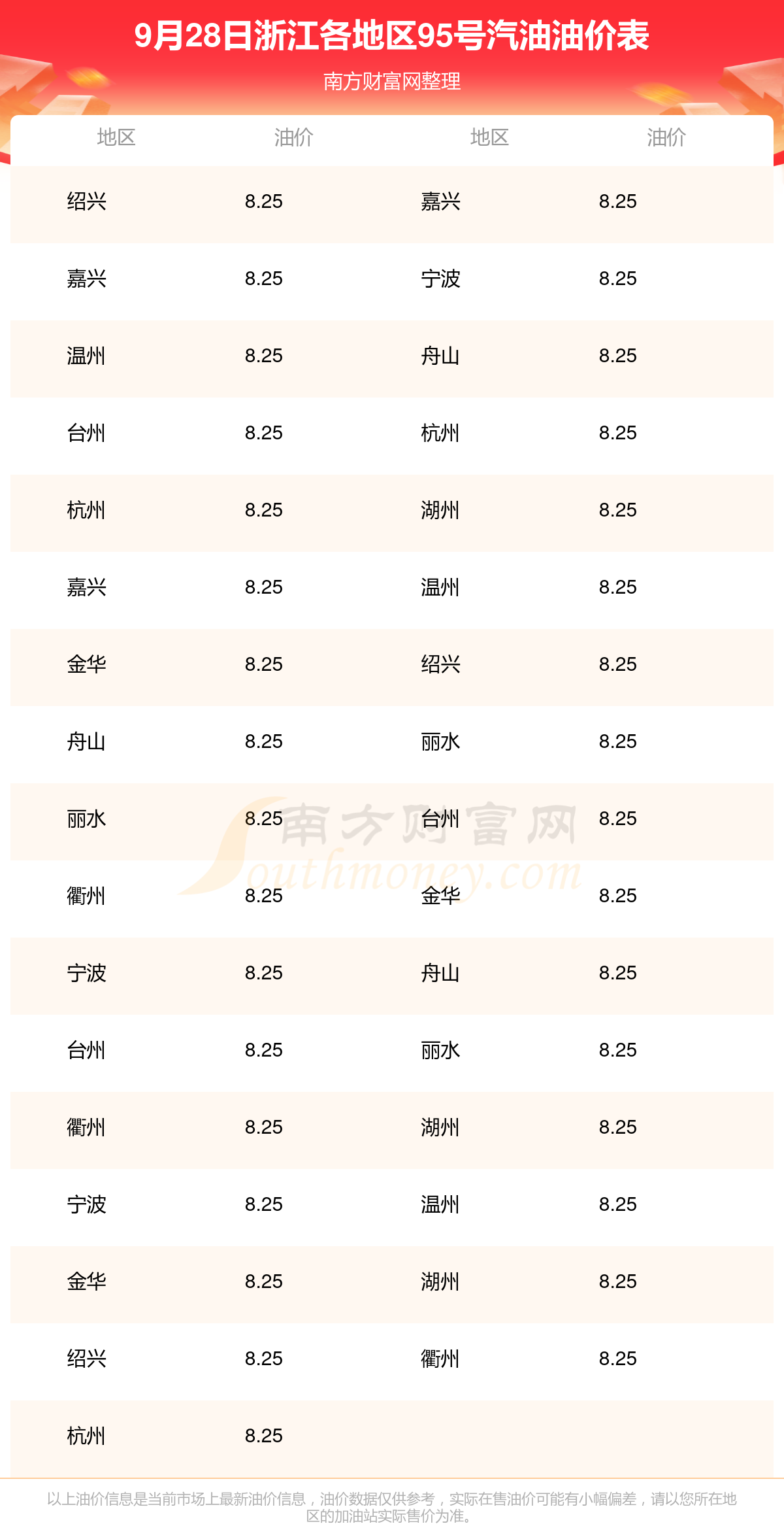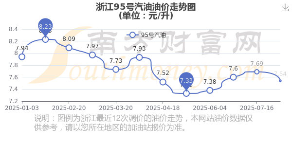 9月28日,浙江95号汽油的这些价格为7.54元每升,调整时间为8月27日,相对上次调整减了0.15元,减1.951%。