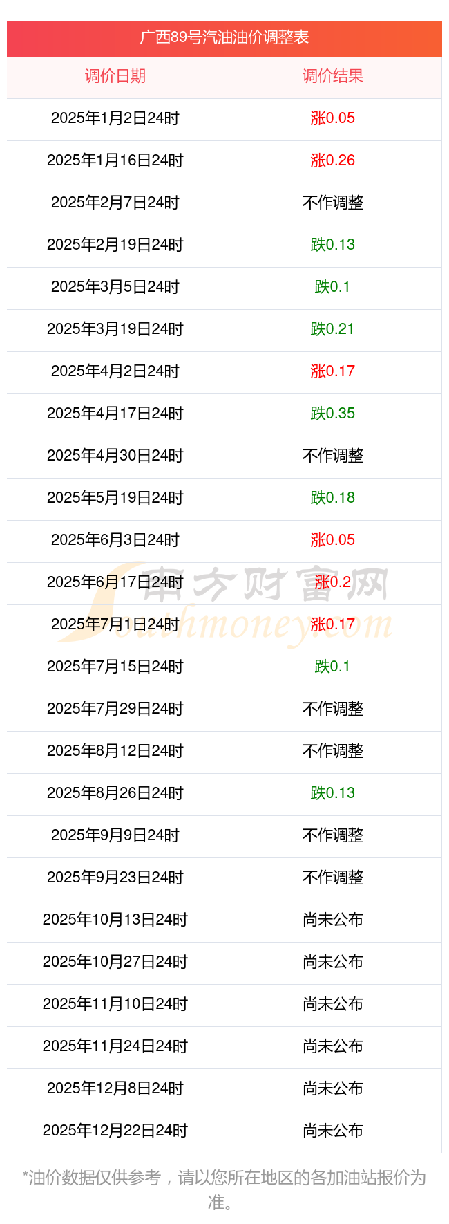 9月28日,广西89号汽油的价格是6.68元每升,本次的调整时间为8月27日,对比上次的调整减了0.13元,减1.909%,10月13日24时为下一轮油价调整时间,还有15.96天。