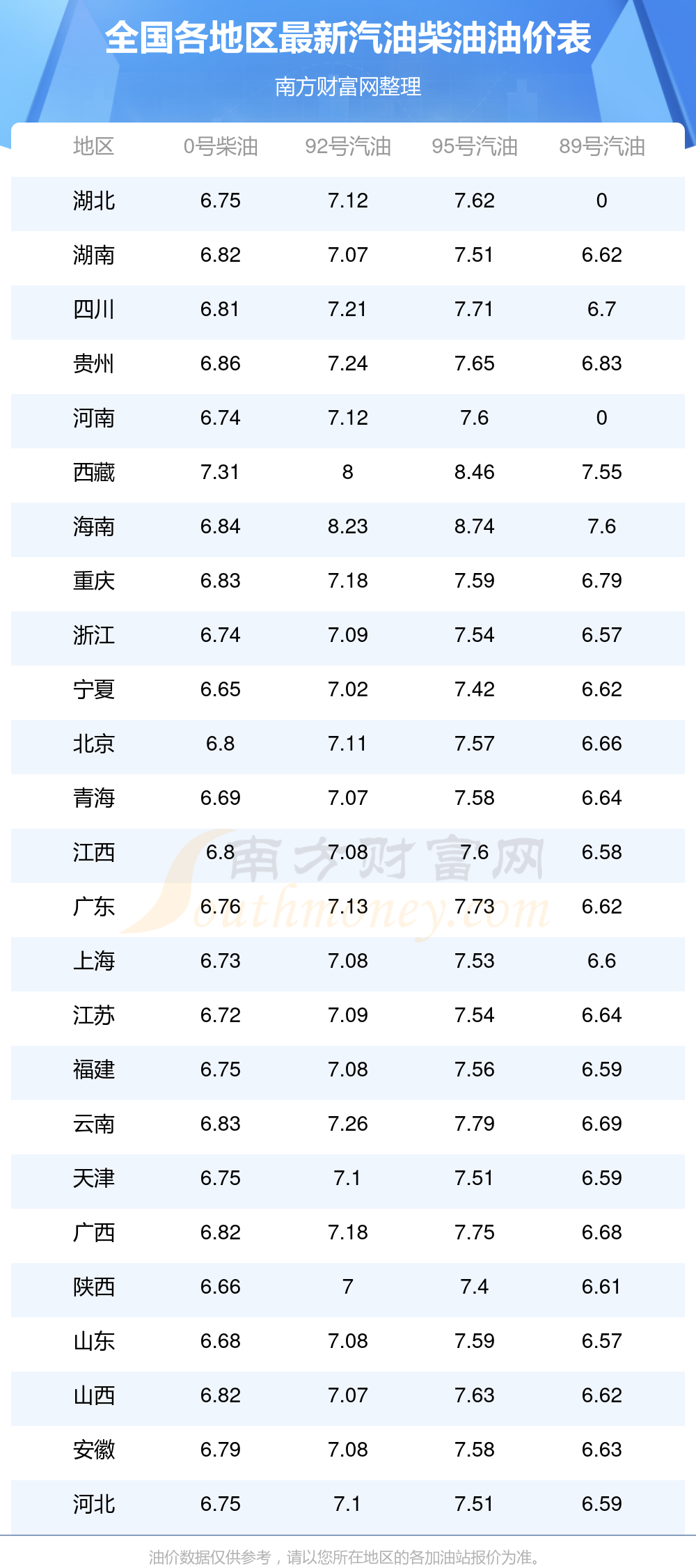 以上数据仅供参考,请以您所在地区的加油站实际售价为准。油价发布此信息的目的在于传播更多信息,对使用该油价信息所导致的结果概不承担责任。