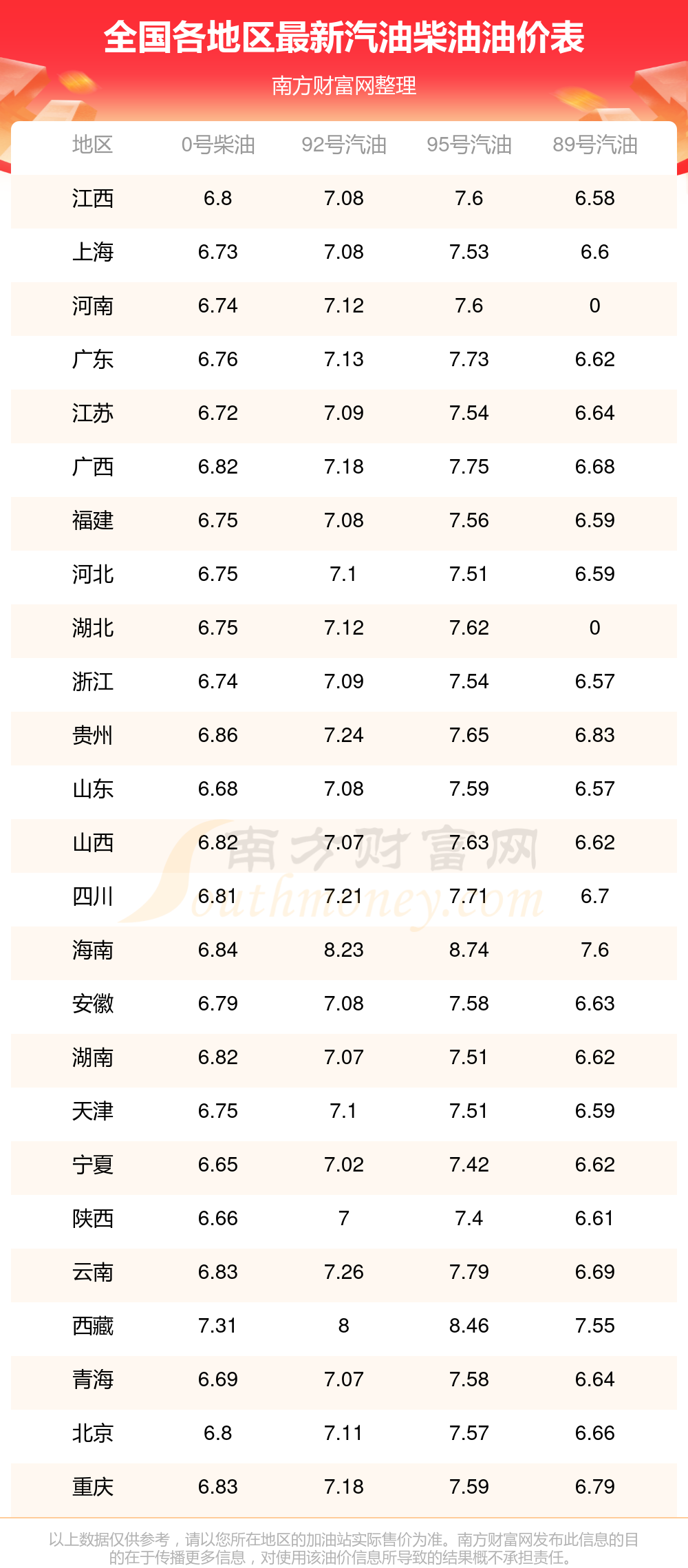 油价数据仅供参考,请以您所在地区的加油站报价为准。油价发布此信息的目的在于传播更多信息,对使用该油价信息所导致的结果概不承担任何责任。