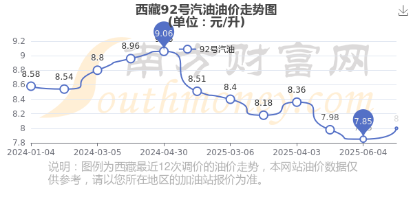 9月28日西藏92号汽油价格为8元每升,本次调整时间为8月27日,相对上次下跌了0.14元,下跌1.72%。