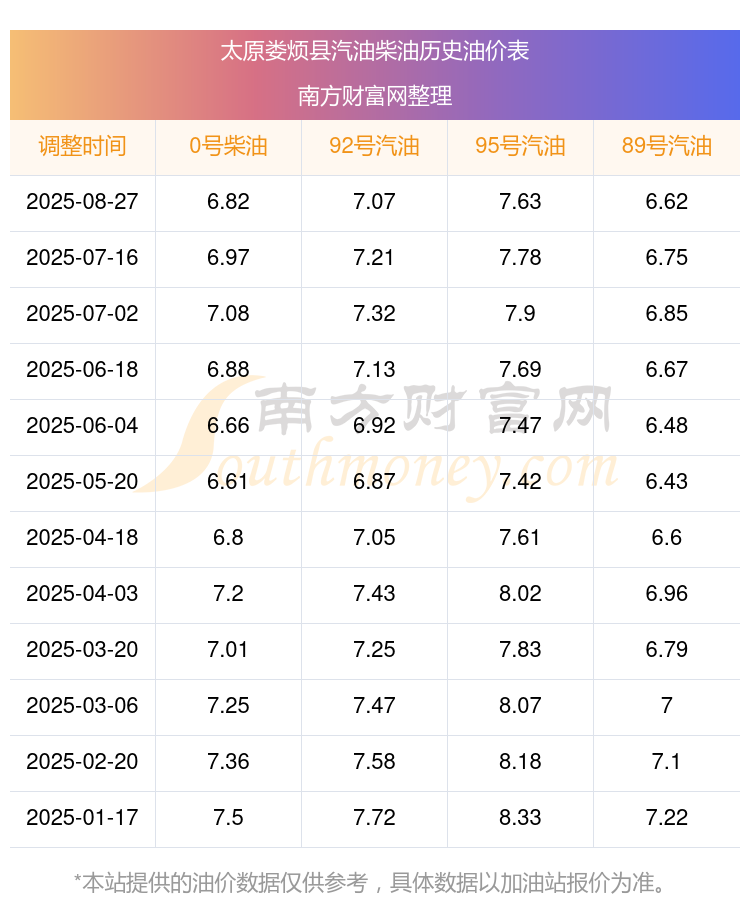 太原娄烦县汽油柴油9月28日每升的价格为8月27日调整后的价格,各油价详情如下:92号汽油7.07元;95号汽油7.63元;89号汽油6.62元;0号柴油6.82元。
