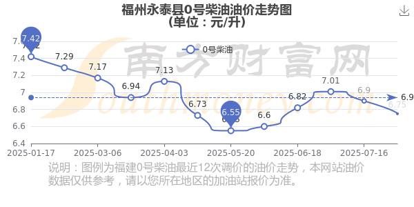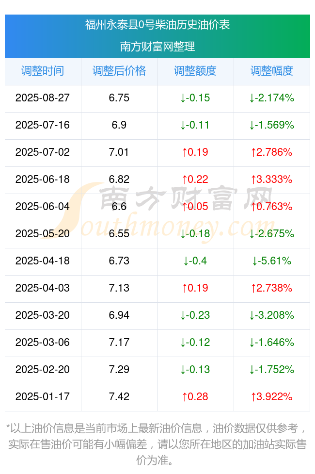 福州永泰县0号柴油9月28日最新价格为6.75元每升,本轮油价调整时间为8月27日,相对上次调整时间7月16日的油价6.9元每升,共下跌了0.15元,下跌2.174%。