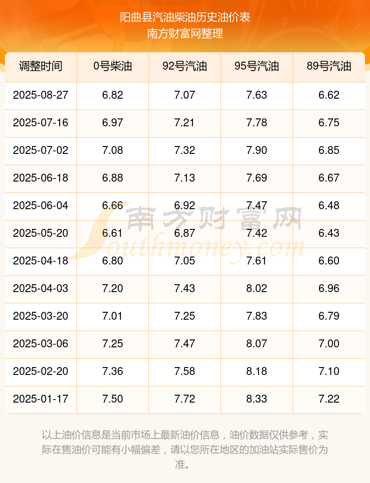 阳曲县汽油、柴油9月28日每升的价格(油价调整时间8月27日):92号汽油7.07元;95号汽油7.63元;89号汽油6.62元;0号柴油6.82元。