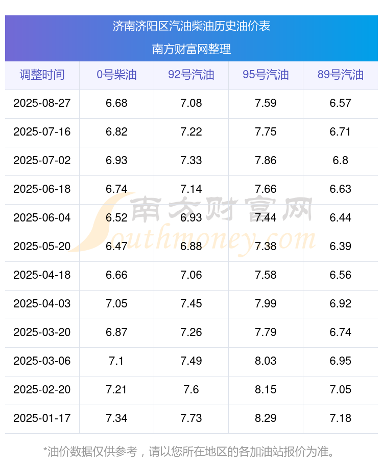 9月28日济南济阳区汽油、柴油每升的价格为:92号汽油为7.08元,跌了0.14元;95号汽油为7.59元,跌了0.16元;89号汽油为6.57元,跌了0.14元;0号柴油为6.68元,跌了0.14元,本轮油价的调整时间为8月27日。