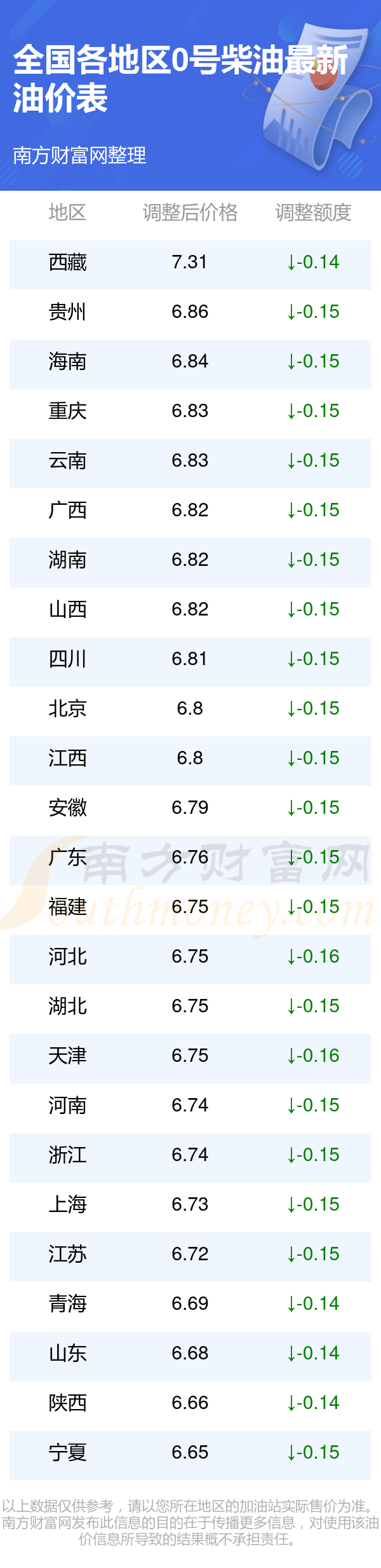 全国各地区最新0号柴油油价表
