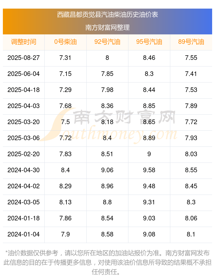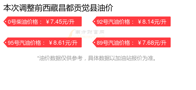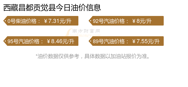 西藏昌都贡觉县汽油柴油9月28日每升的价格为8月27日调整后的价格,各油价详情如下:92号汽油8元;95号汽油8.46元;89号汽油7.55元;0号柴油7.31元。