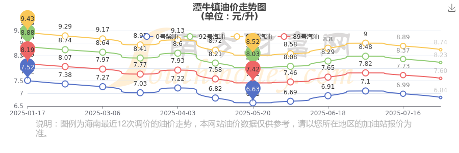 潭牛镇汽油、柴油9月28日每升最新价格为:0号柴油为6.84元,降了0.15元;95号汽油为8.74元;92号汽油为8.23元;89号汽油为7.6元,调整时间为8月27日。