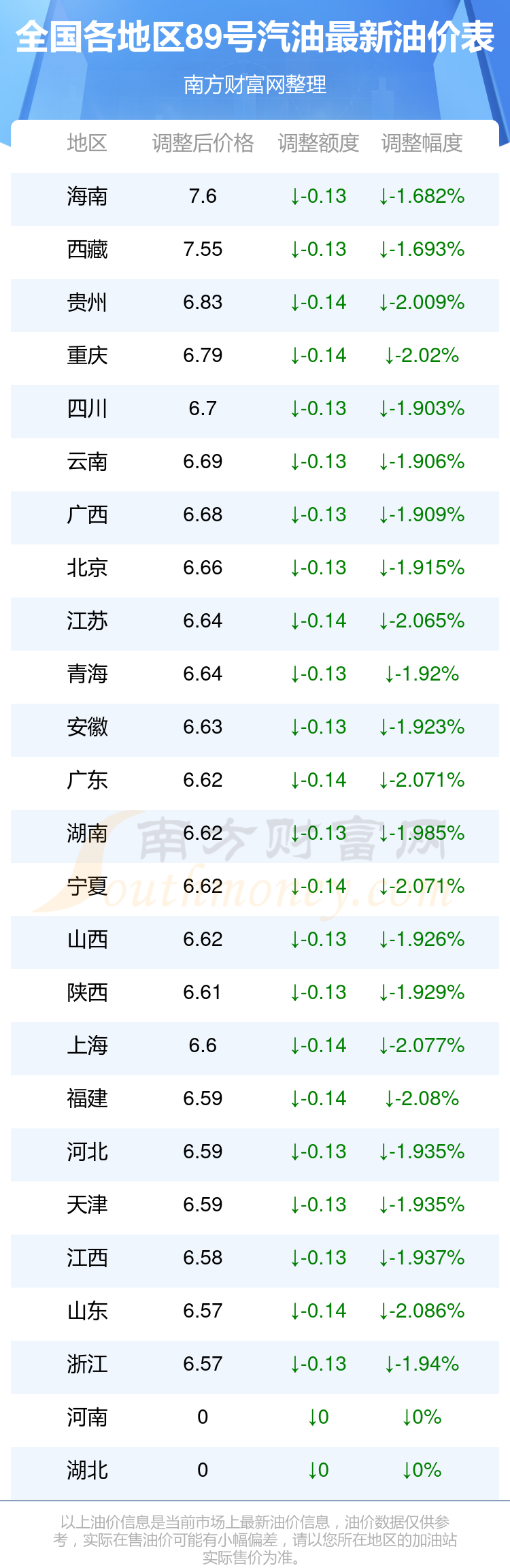 9月28日,全国89号汽油最新平均价格为:7元每升,调整时间为8月27日,其中,全国89号汽油最低为浙江,价格为6.57元/升,89号汽油最高为海南,价格为7.60元/升。