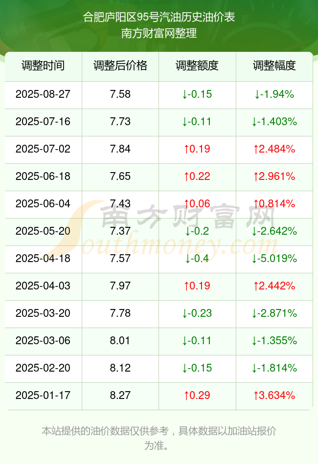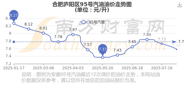 9月28日合肥庐阳区95号汽油价格:7.58元每升,调整时间为8月27日,相对上次调整跌了0.15元。