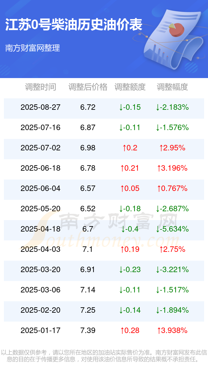 江苏0号柴油9月28日价格为6.72元/升,调整时间为8月27日,对比上次调整减了0.15元。