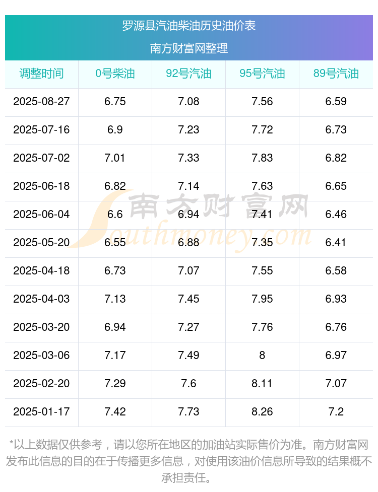 罗源县汽油、柴油9月28日每升的价格为8月27日调整后的价格:92号汽油7.08元;95号汽油7.56元;89号汽油6.59元;0号柴油6.75元。