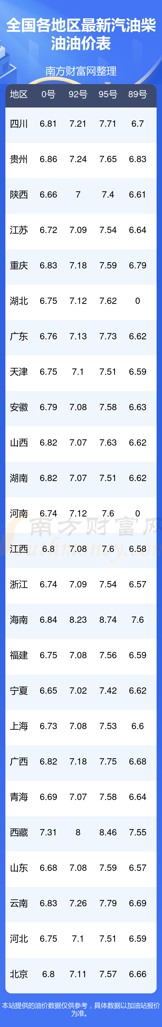 以上数据仅供参考,请以您所在地区的加油站实际售价为准。油价发布此信息的目的在于传播更多信息,对使用该油价信息所导致的结果概不承担责任。