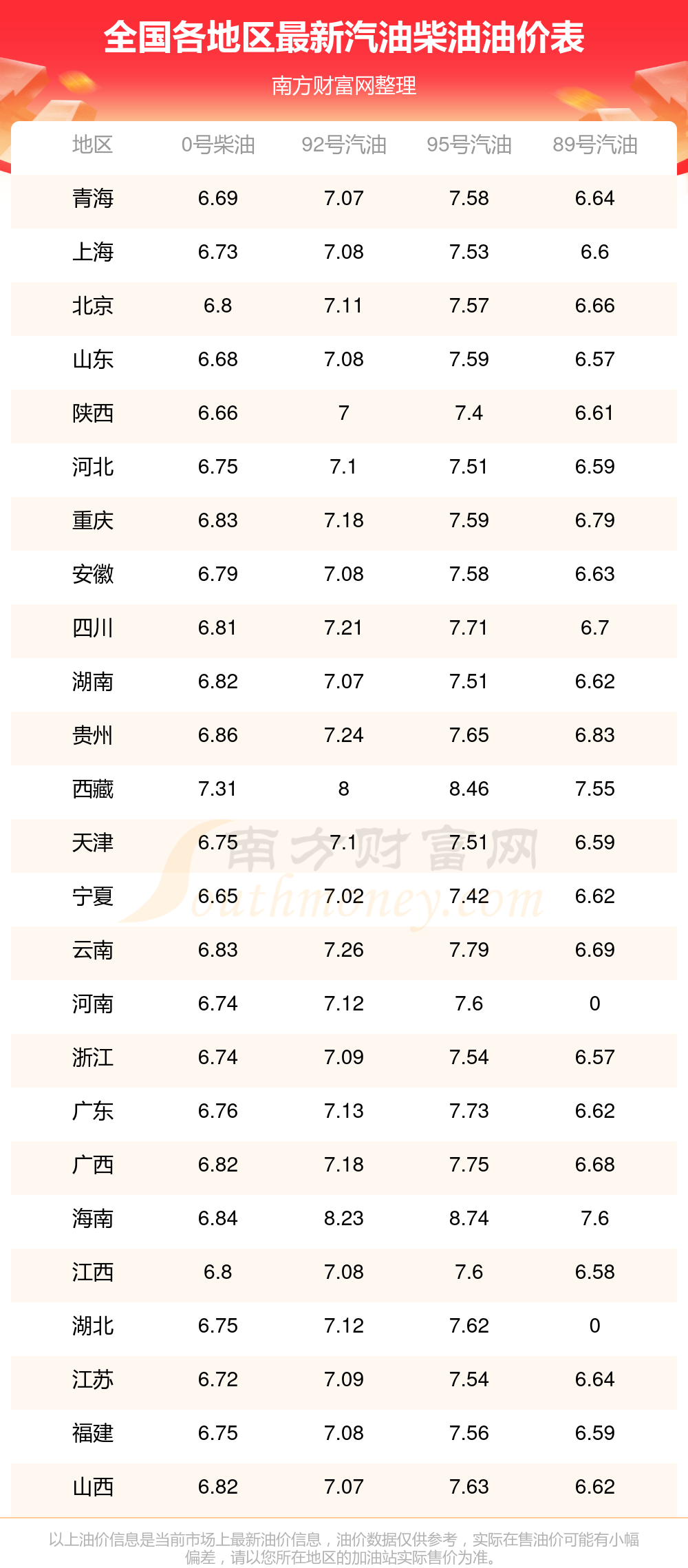 以上油价信息是当前市场上最新油价信息,油价数据仅供参考,实际在售油价可能有小幅偏差,请以您所在地区的加油站实际售价为准。