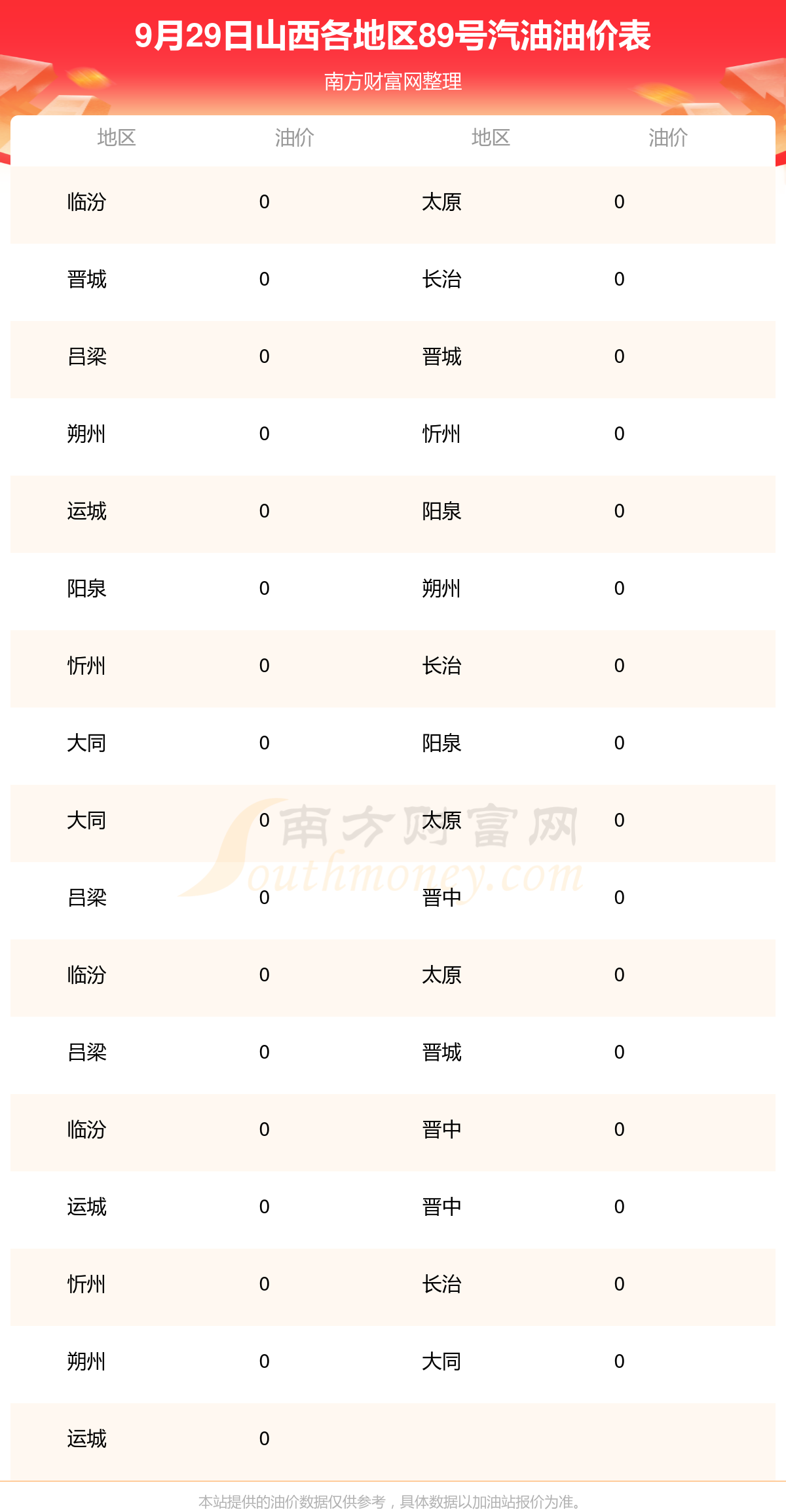 山西各地区最新89号汽油油价表