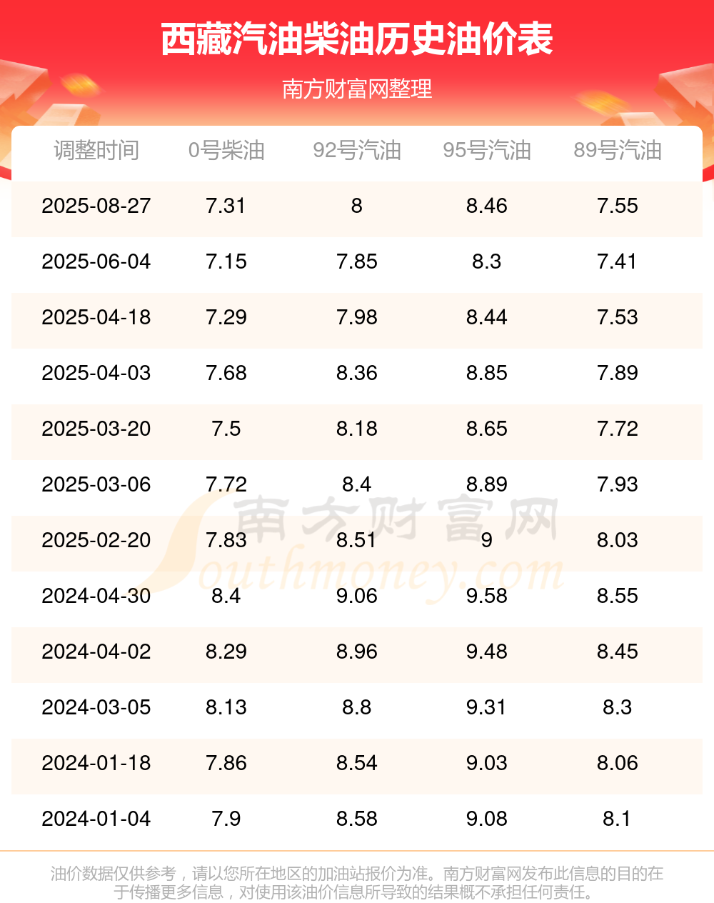 西藏汽油柴油历史油价表