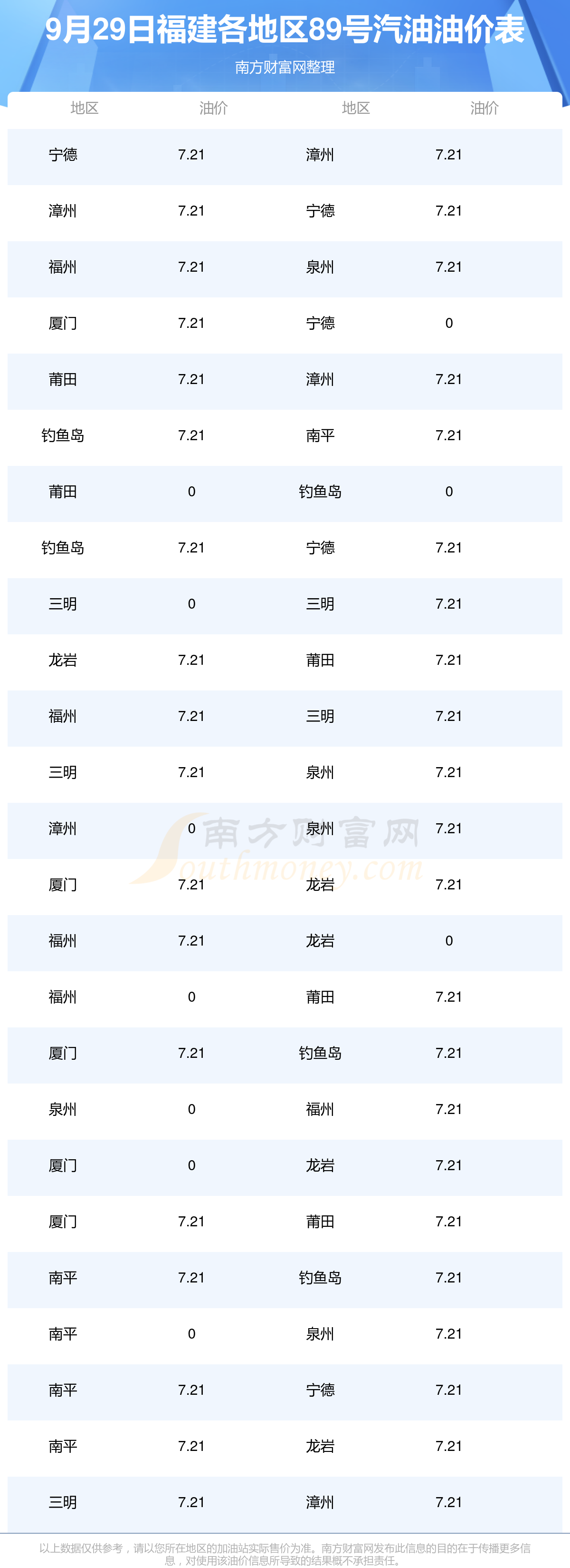 9月29日,福建89号汽油的最新价格为6.59元/升,本轮油价调整时间是8月27日,对比上次调整共降了0.14元,降2.08%。