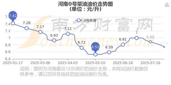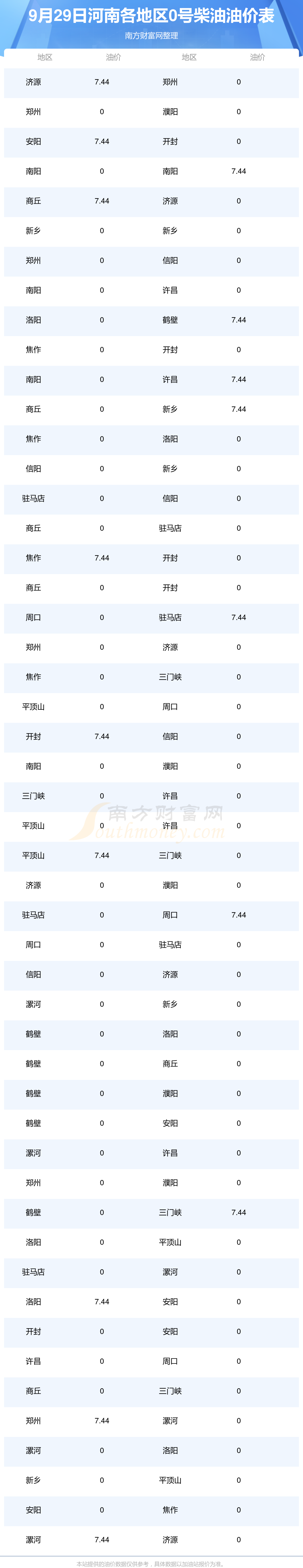 9月29日,河南0号柴油的这些价格为6.74元每升,调整时间为8月27日,相对上次调整降了0.15元,降2.177%。