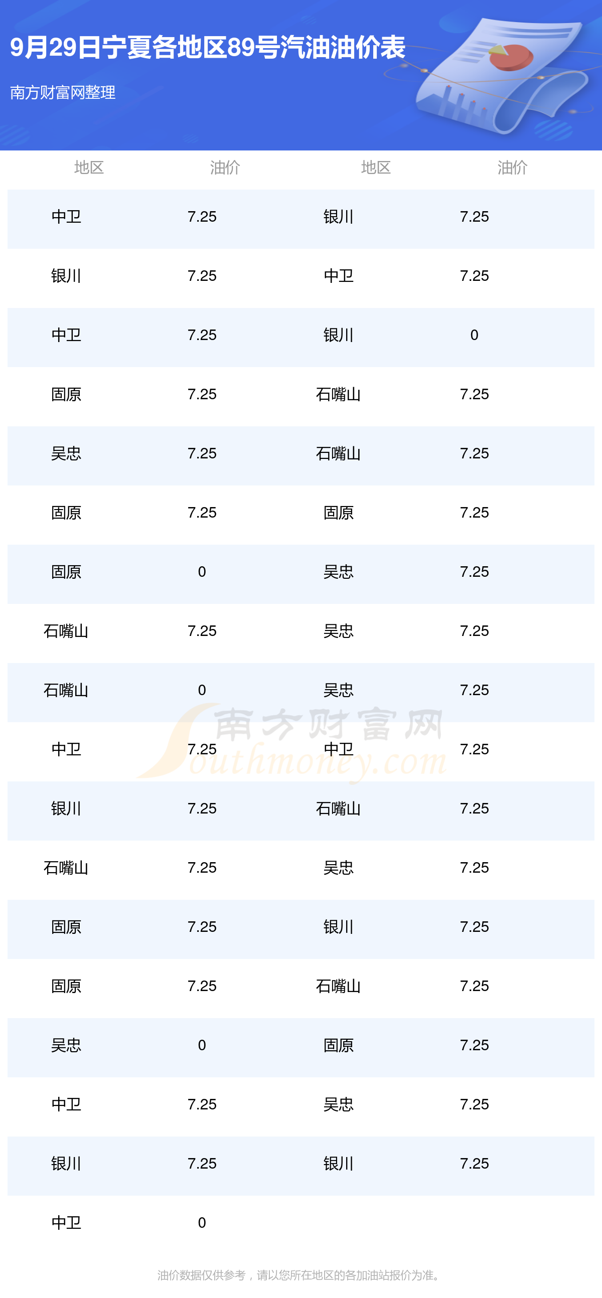 9月29日,宁夏89号汽油的价格是8月27日调整后的价格,为6.62元每升,对比上一轮油价调整共下跌了0.14元。