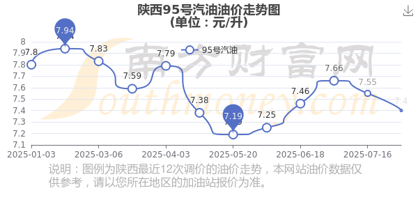9月29日,陕西95号汽油的价格是7.4元每升,本次的调整时间为8月27日,对比上次的调整降了0.15元,降1.987%,10月13日24时为下一轮油价调整时间,还有14.96天。