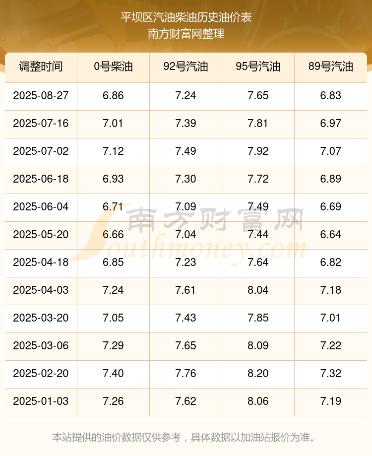 平坝区汽油、柴油9月29日每升的价格具体是(8月27日调整后的价格):92号汽油7.24元;95号汽油7.65元;89号汽油6.83元;0号柴油6.86元。