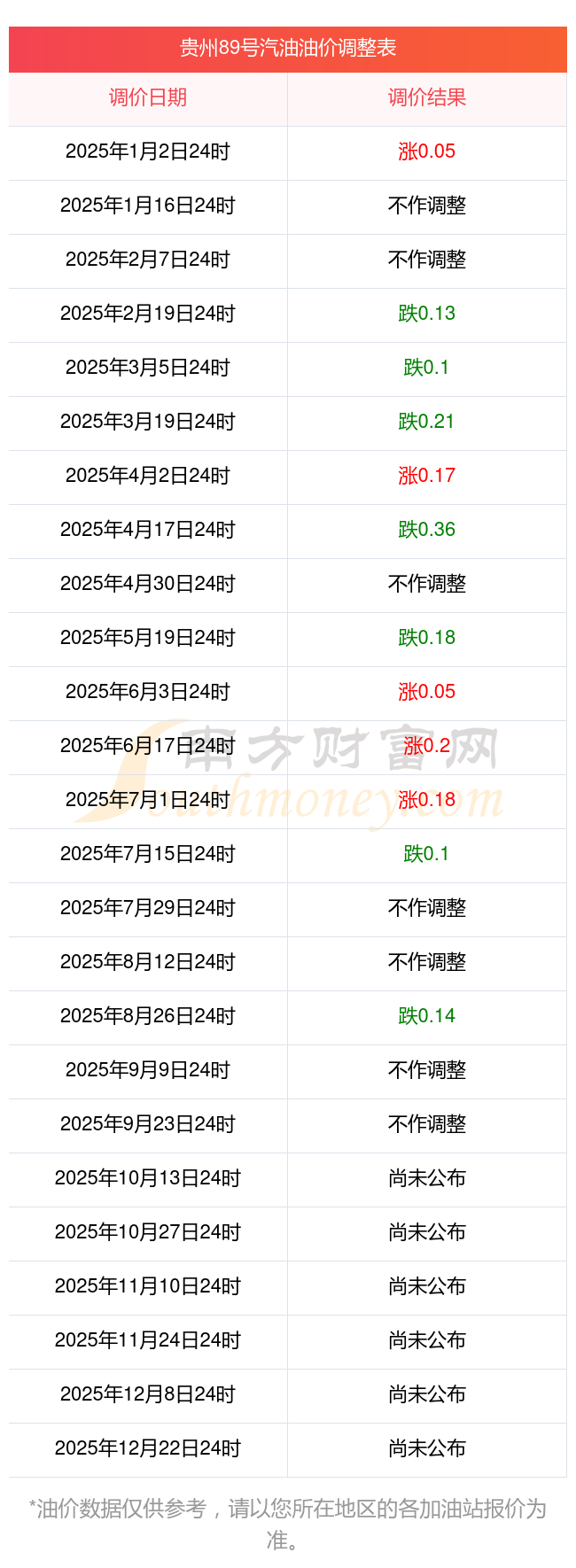 2025年油价调整一览表