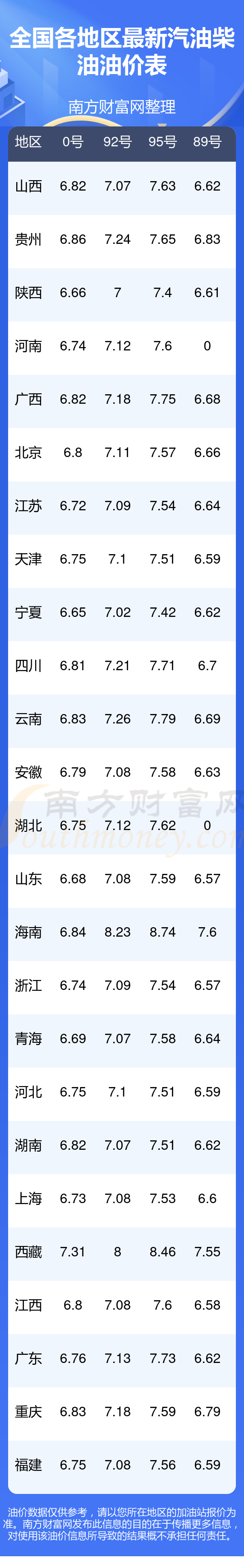 以上数据仅供参考,请以您所在地区的加油站实际售价为准。油价发布此信息的目的在于传播更多信息,对使用该油价信息所导致的结果概不承担责任。