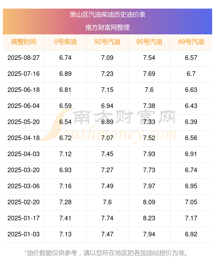 萧山区汽油、柴油9月29日每升的价格(油价调整时间8月27日):92号汽油7.09元;95号汽油7.54元;89号汽油6.57元;0号柴油6.74元。