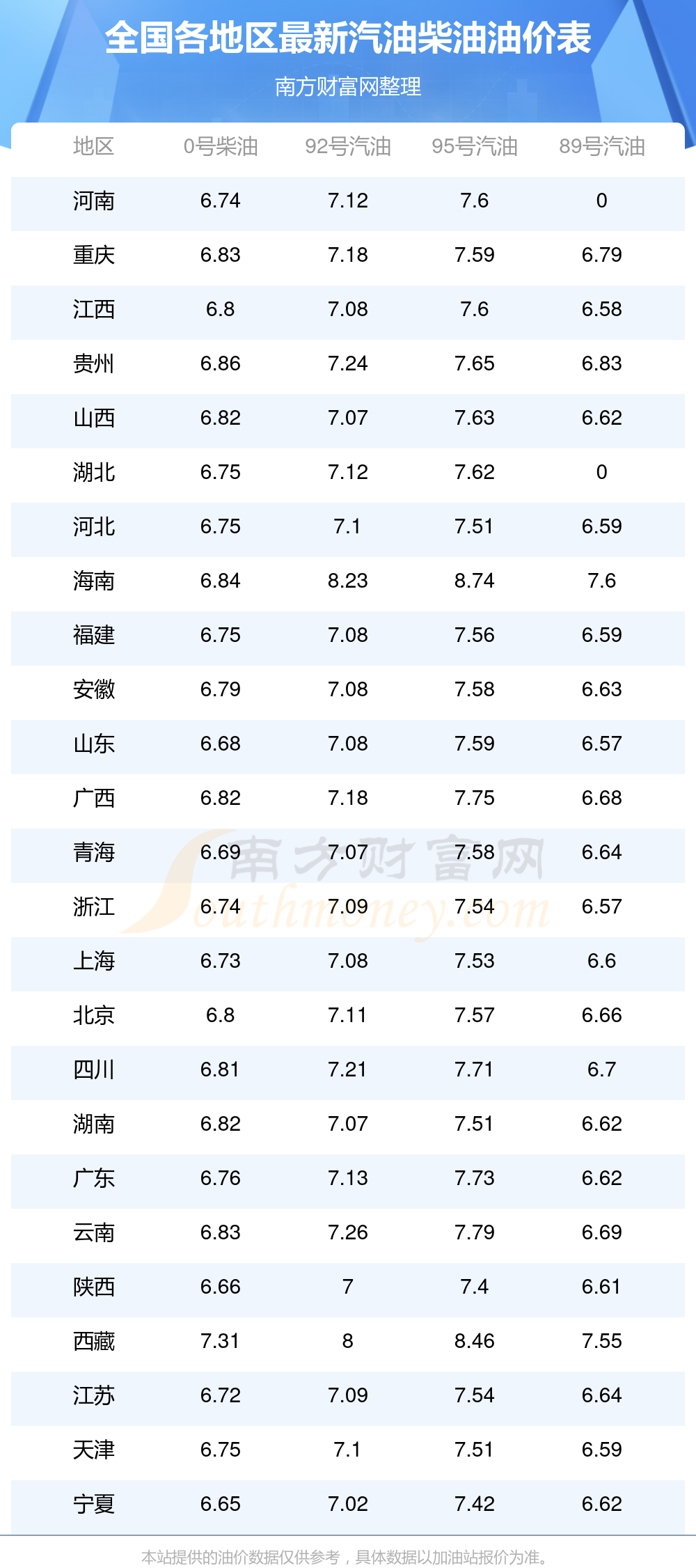 以上数据仅供参考,请以您所在地区的加油站实际售价为准。油价发布此信息的目的在于传播更多信息,对使用该油价信息所导致的结果概不承担责任。