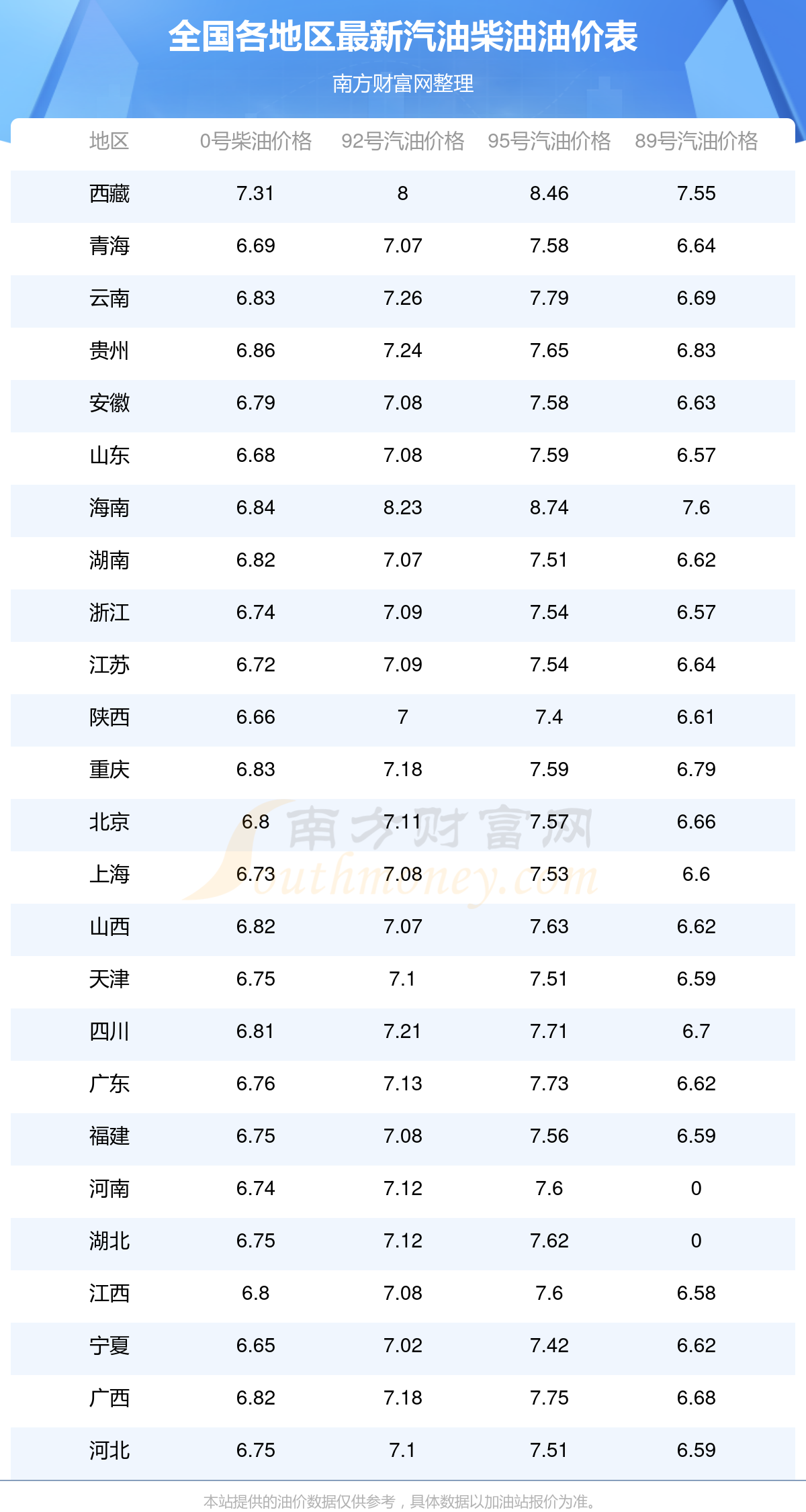 以上数据仅供参考,请以您所在地区的加油站实际售价为准。油价发布此信息的目的在于传播更多信息,对使用该油价信息所导致的结果概不承担责任。