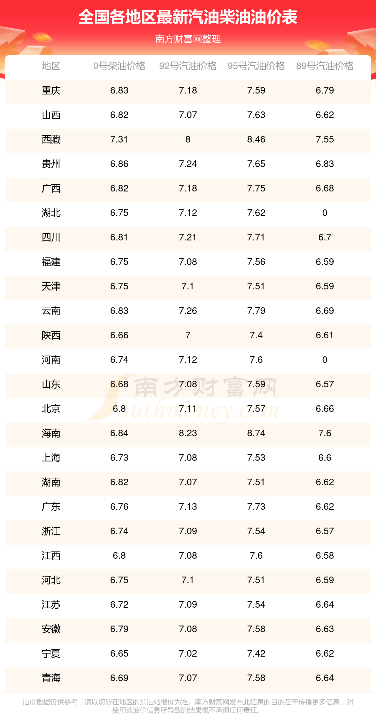 以上数据仅供参考,请以您所在地区的加油站实际售价为准。油价发布此信息的目的在于传播更多信息,对使用该油价信息所导致的结果概不承担责任。