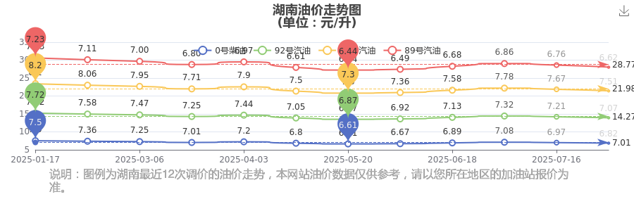 9月30日,湖南汽油、柴油每升最新价格为:调整时间为8月27日,92号汽油为7.07元,降了0.14元,降幅达1.99%;95号汽油为7.51元,降了0.15元,降幅达1.99%;89号汽油为6.62元,降了0.13元,降幅达1.99%;0号柴油为6.82元,降了0.15元,降幅达2.17%。