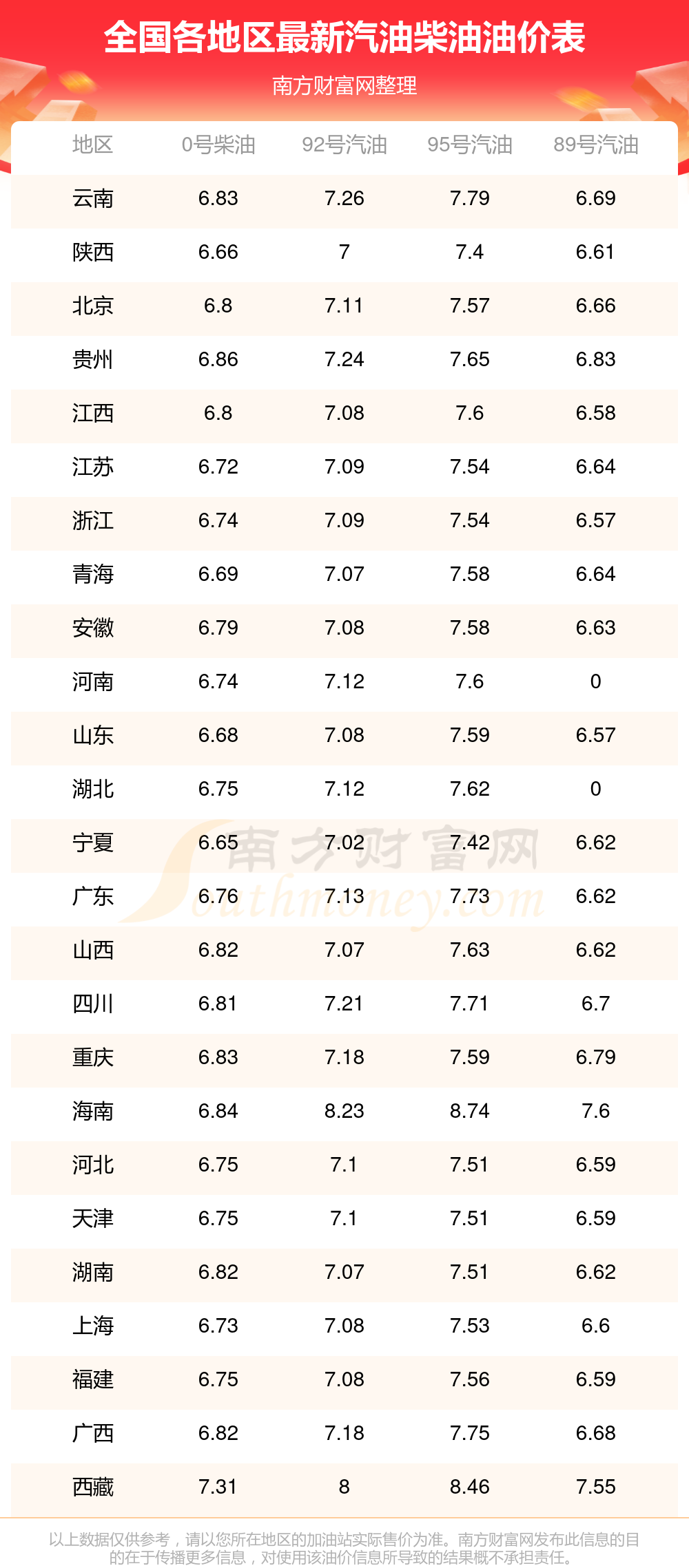 以上油价信息是当前市场上最新油价信息,油价数据仅供参考,实际在售油价可能有小幅偏差,请以您所在地区的加油站实际售价为准。