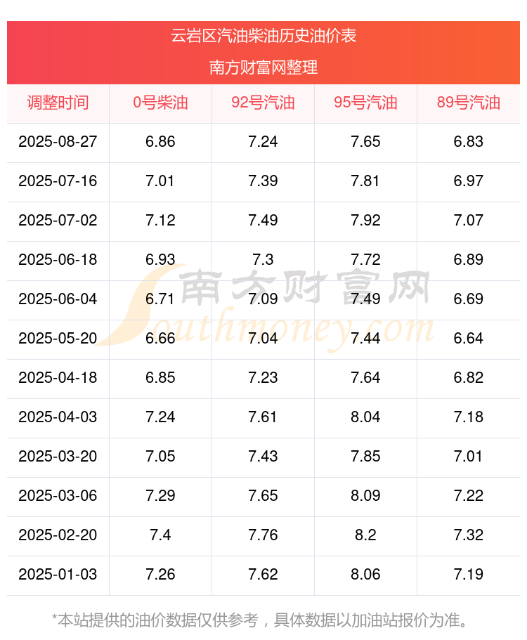 云岩区汽油、柴油9月30日每升的价格为(油价调整时间是8月27日):92号汽油7.24元;95号汽油7.65元;89号汽油6.83元;0号柴油6.86元。