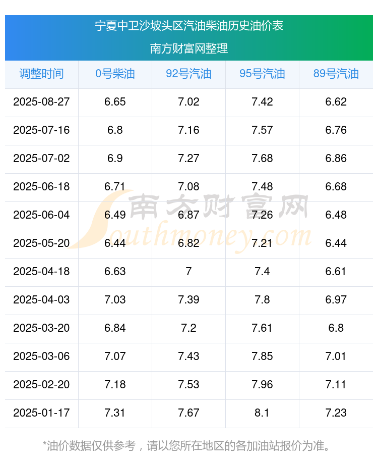 宁夏中卫沙坡头区汽油、柴油9月30日的价格是多少钱一升?详情为:92号汽油为7.02元,下跌了0.14元;95号汽油为7.42元,下跌了0.15元;89号汽油为6.62元,下跌了0.14元;0号柴油为6.65元,下跌了0.15元,本次油价的调整时间为8月27日。