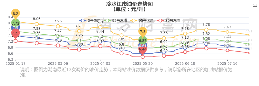 9月30日冷水江市汽油柴油每升的价格为8月27日调整后的价格,具体如下:92号汽油7.07元;95号汽油7.51元;89号汽油6.62元;0号柴油6.82元。