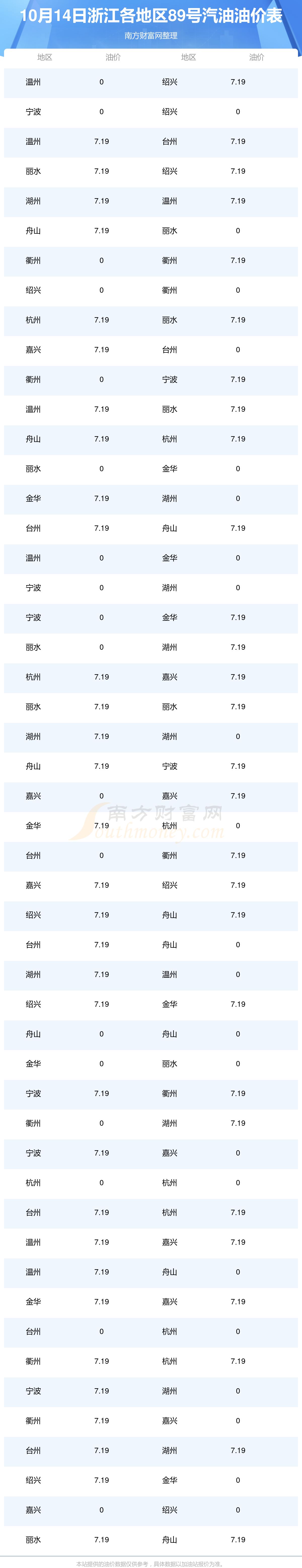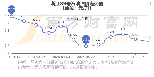 10月14日浙江89号汽油最新油价是6.52元/升,本轮调整时间为10月14日,相对上一轮调整时间8月27日的油价6.57元/升,跌了0.05元。