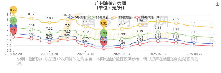 10月14日广州汽油、柴油的价格是10月14日调整后的价格,每升价格为:92号汽油为7.07元,下降了0.06元,下降幅达0.84%;95号汽油为7.66元,下降了0.07元,下降幅达0.91%;89号汽油为6.57元,下降了0.05元,下降幅达0.76%;0号柴油为6.7元,下降了0.06元,下降幅达0.89%。