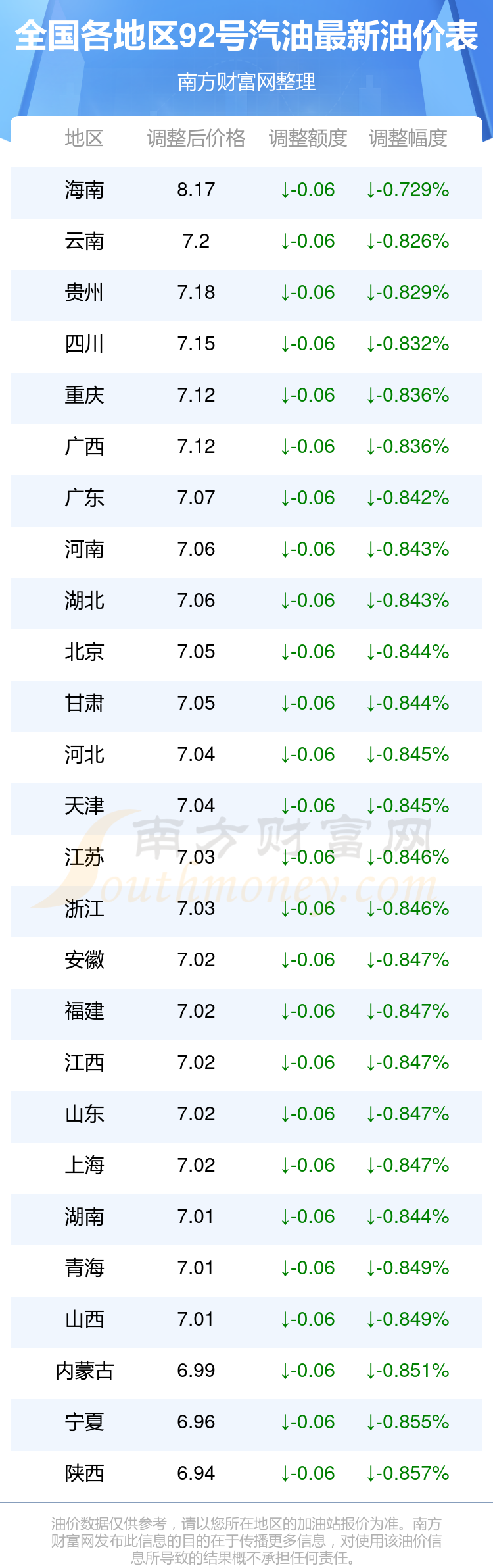 全国各地区最新92号汽油油价表