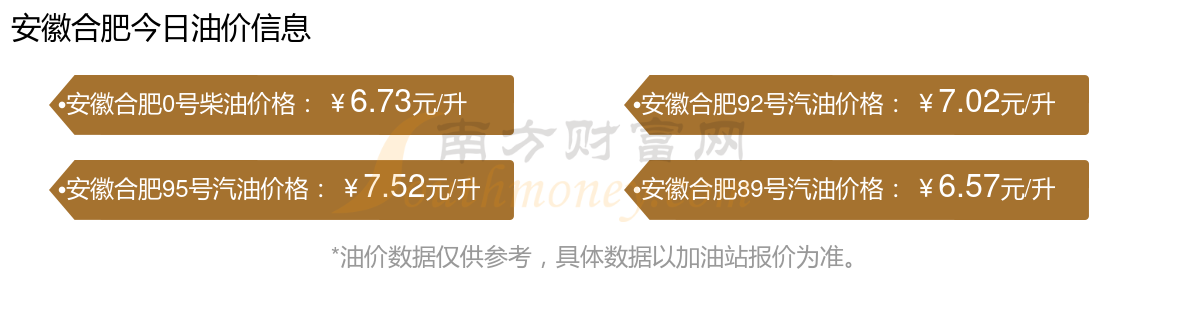 安徽合肥汽油、柴油10月14日每升的价格为(油价调整时间是10月14日):92号汽油7.02元;95号汽油7.52元;89号汽油6.57元;0号柴油6.73元。