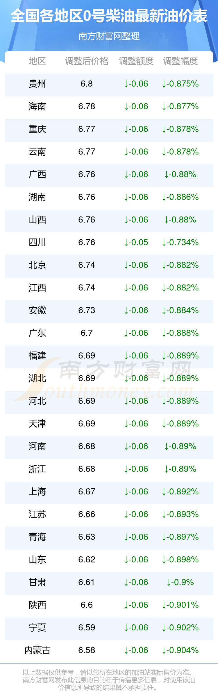 全国各地区最新0号柴油油价表