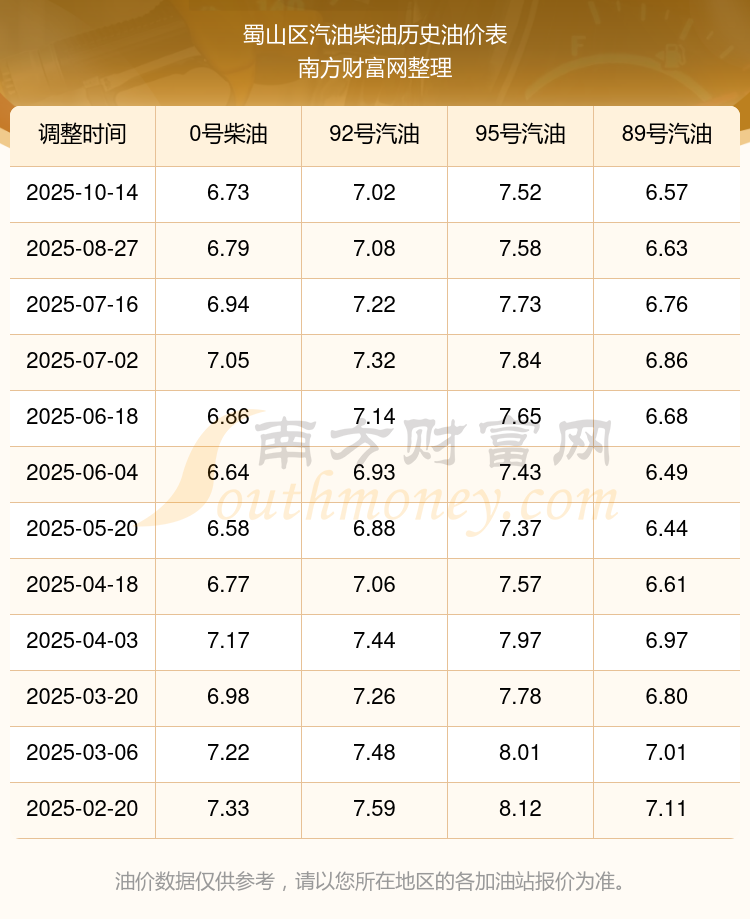 蜀山区今日油价:10月14日蜀山区汽油柴油价格查询