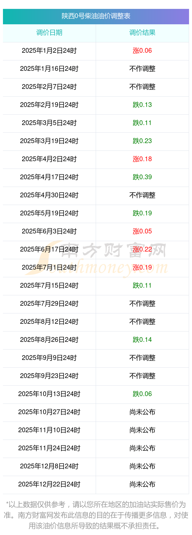 10月14日,陕西0号柴油最新油价是6.6元每升,本轮调整时间为10月14日,相对上轮调整时间8月27日的油价6.66元/升,减了0.06元。