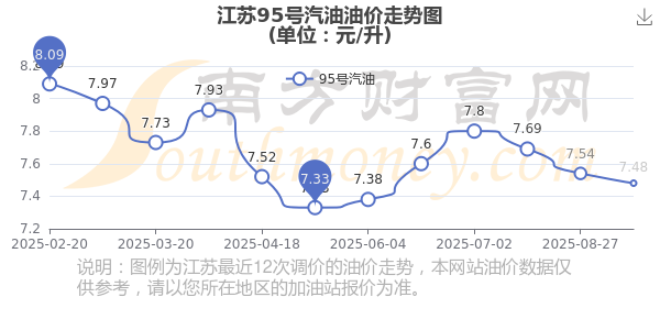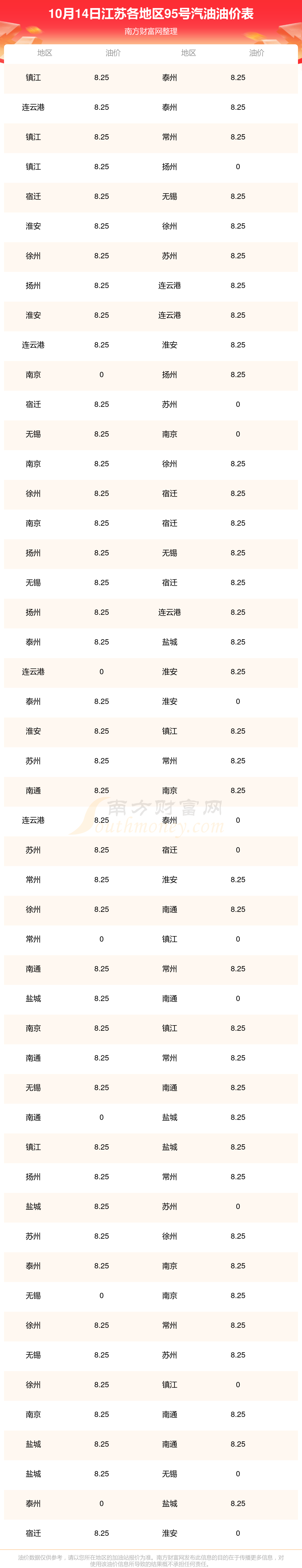 10月14日江苏95号汽油最新价格为7.48元每升,这是10月14日调整后的价格,对比上次油价调整减了0.06元,减0.796%。