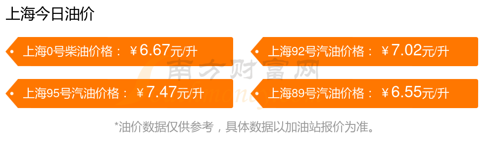 10月14日上海汽油、柴油每升的最新价格:92号汽油7.02元;95号汽油7.47元;89号汽油6.55元,下调了0.05;0号柴油6.67元,本轮油价的调整时间是10月14日。