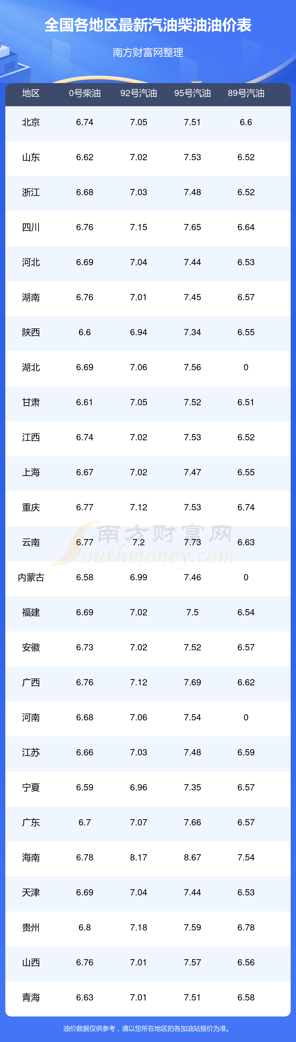 油价数据仅供参考,请以您所在地区的各加油站报价为准。