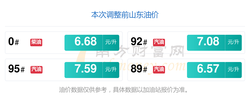 10月14日,山东汽油、柴油价格的调整时间为10月14日。每升最新价格为:92号汽油为7.02元,降了0.06元;95号汽油为7.53元,降了0.06元;89号汽油为6.52元,降了0.05;0号柴油为6.62元,降了0.06元。