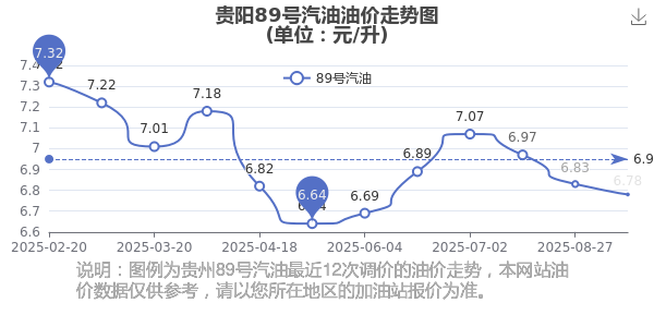 10月14日贵阳89号汽油的价格为10月14日调整后的价格,具体为:6.78元每升,相对上次调整时间8月27日的油价6.83元每升,减了0.05元,减幅达0.732%。