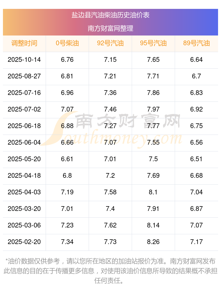 10月14日盐边县汽油、柴油价格是多少钱一升?10月14日调整后,92号汽油为7.15元,降了0.06元,降幅达0.83%;95号汽油为7.65元,降了0.06元,降幅达0.78%;89号汽油为6.64元,降了0.06元,降幅达0.9%;0号柴油为6.76元,降了0.05元,降幅达0.73%。