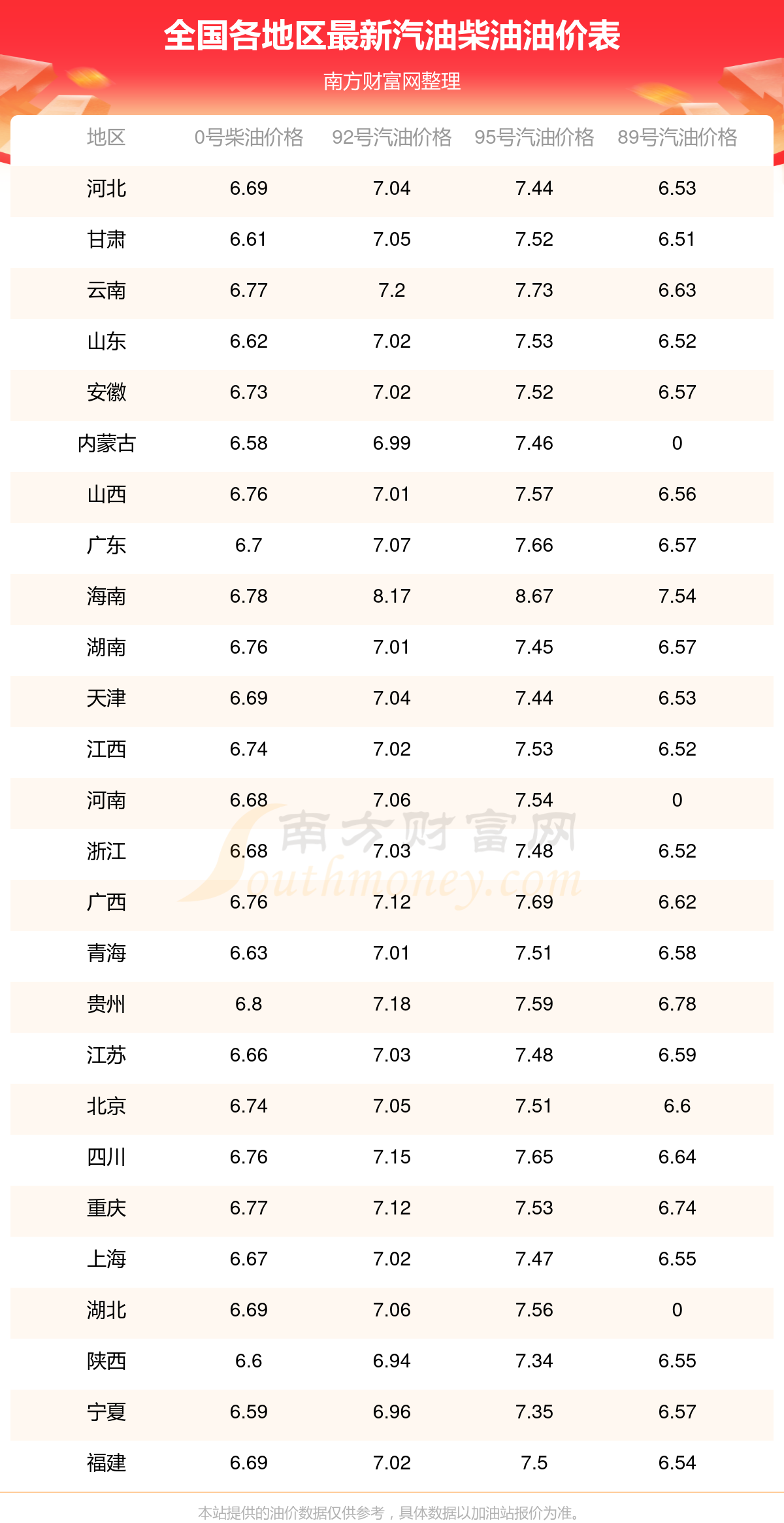 以上油价信息是当前市场上最新油价信息,油价数据仅供参考,实际在售油价可能有小幅偏差,请以您所在地区的加油站实际售价为准。